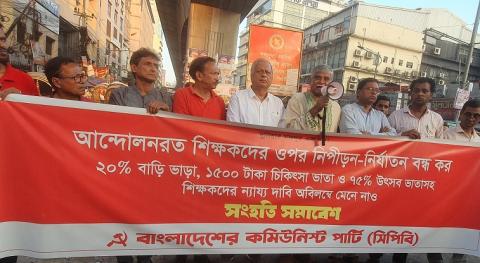 কেন্দ্রীয় শহীদ মিনারে শিক্ষকদের অবস্থান আন্দোলনে সংহতি বক্তব্যে সিপিবির সাধারণ সম্পাদক আবদুল্লাহ ক্বাফী রতন বলেন, সারাদেশে চাকরিজীবীরা মূল বেতনের ৪০ থেকে ৫৫ শতাংশ পর্যন্ত বাড়ি ভাড়া ভাতা পান। সেখানে ভবিষ্যত প্রজন্ম তৈরির কারিগর এমপিওভুক্ত বেসরকারি শিক্ষাপ্রতিষ্ঠানের শিক্ষকগণ মাত্র ১ হাজার টাকা বাড়ি ভাড়া ভাতা পেয়ে থাকেন। তিনি বলেন, এই টাকায় সপরিবার তো দূরের কথা মেসের সিট ভাড়া সংকুলান সম্ভব নয়। শিক্ষকগণ মাত্র ২০ শতাংশ বাড়ি ভাড়া চেয়েছেন, বিনিময়ে পেয়েছেন অপমান ও পুলিশের নির্যাতন। অন্তর্বর্তীকালীন সরকার ন্যায্য দাবি উত্থাপন করা শিক্ষকদের প্রতি যে অবমাননা ও অসম্মানজনক আচরণ করেছে তা কোন সভ্য নজির নয়। তিনি ন্যায্য দাবির আন্দোলনে সর্বাত্মকভাবে সিপিবি শিক্ষকদের পাশে থাকবে বলে অঙ্গীকার করেন।