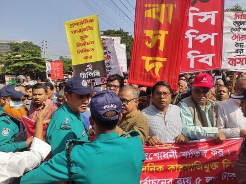 বাম জোটের নেতাকর্মীরা আগারগাঁও মেট্রো স্টেশনে জমায়েত হয়ে মিছিল নিয়ে নির্বাচন কমিশনার বরাবর স্মারকলিপি প্রদান করতে এগিয়ে গেলে পুলিশের বাধার মুখে পড়ে। পরবর্তীতে ভবনের সামনে সমাবেশ করে জোটের নেতাকর্মীরা।