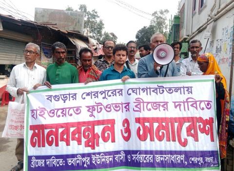 বগুড়ার শেরপুর উপজেলার ঘোগা বটতলায় ফুটওভার ব্রিজ নির্মাণের দাবিতে মানববন্ধন ও সমাবেশ গত ১৬ এপ্রিল অনুষ্ঠিত হয়েছে। দিনব্যাপী ভবানীপুর ইউনিয়ন পরিষদের গেট, বিশ্বা বাজার এবং ঘোগা বটতলায় পৃথক-পৃথকভাবে আয়োজিত কর্মসূচিতে সভাপতিত্ব করেন বাংলাদেশের কমিউনিস্ট পার্টি (সিপিবি) শেরপুর উপজেলা শাখার সভাপতি বীর মুক্তিযোদ্ধা হরিশংকর সাহা।