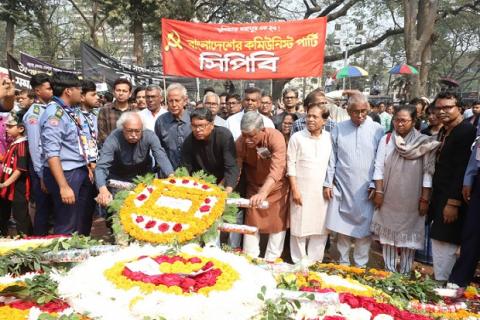 একুশে ফেব্রুয়ারির সকালে কেন্দ্রীয় শহীদ মিনারে শ্রদ্ধা নিবেদন করে সিপিবির কেন্দ্রীয় নেতৃবৃন্দ [ ছবি: রতন কুমার দাস ]